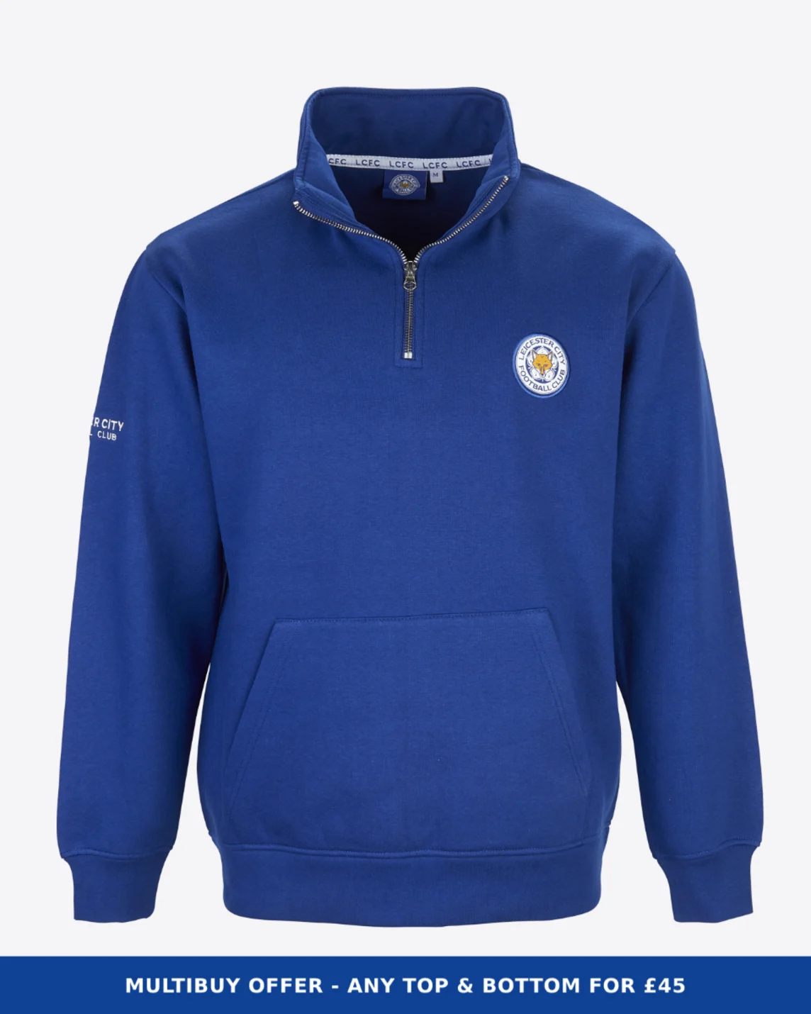 Complete your everyday essential look with our blue 1/4 zip top. Featuring an embroidered club crest and white, stitched detailing on the right sleeve, complete with a kangaroo pocket and smart, fold down collar.