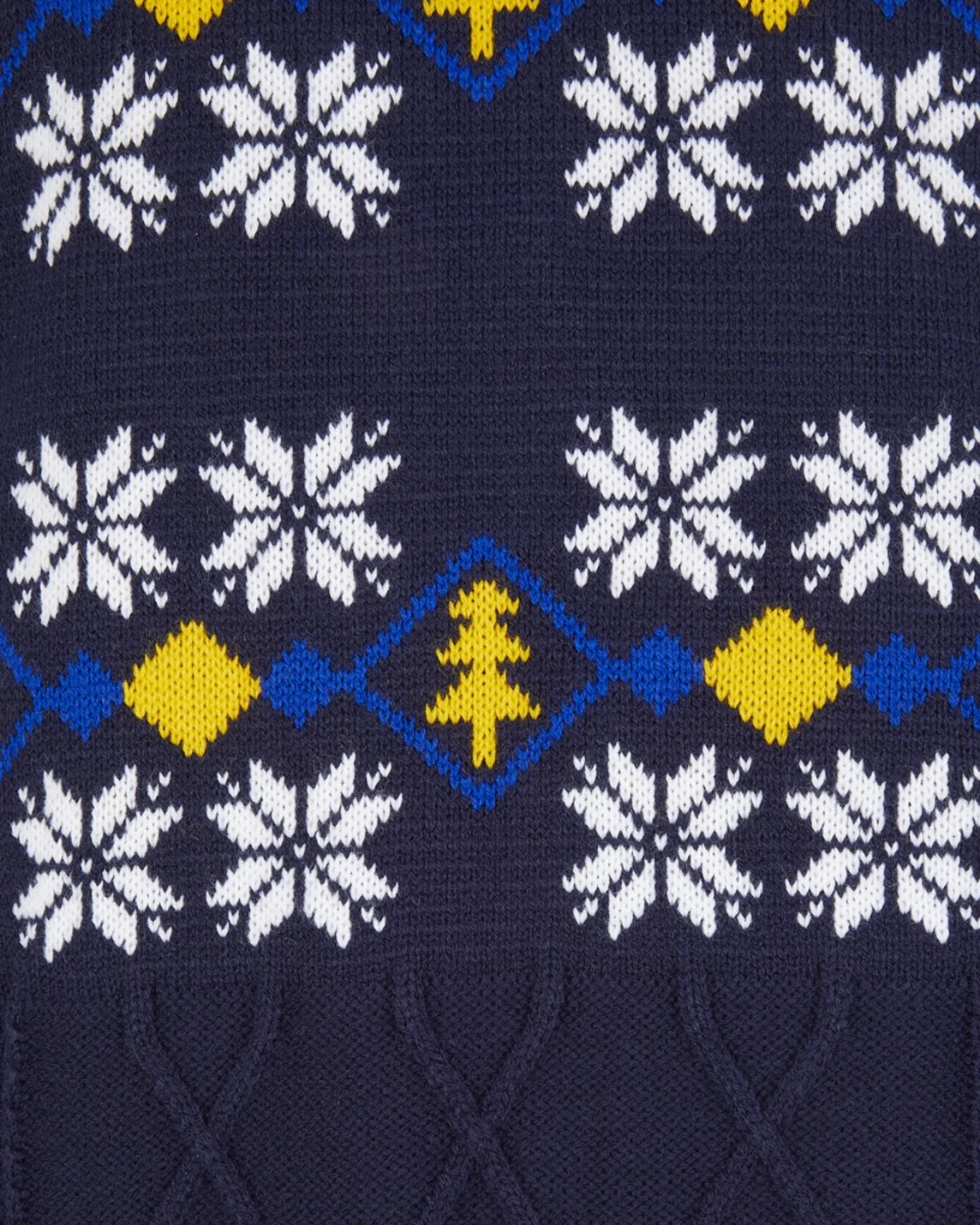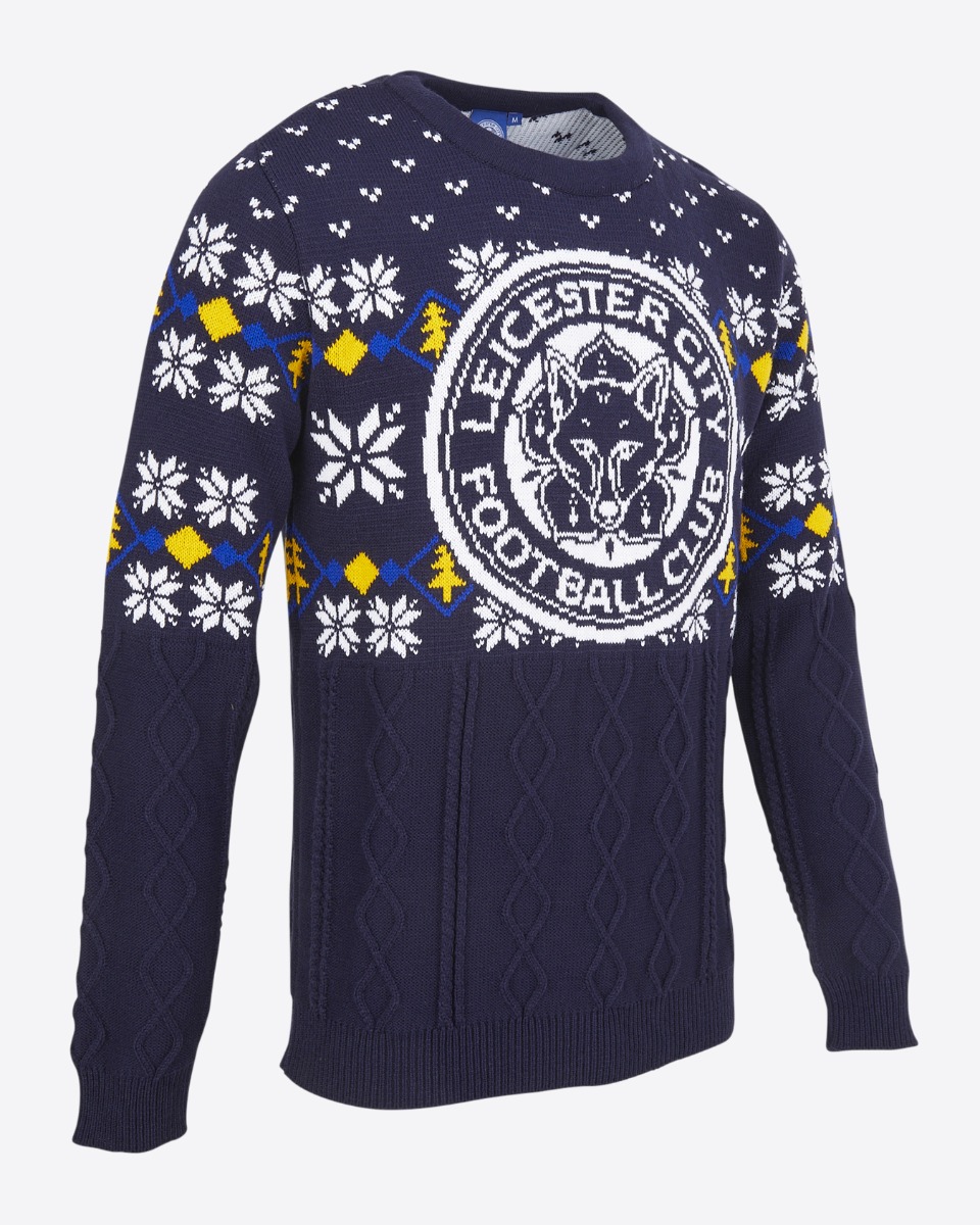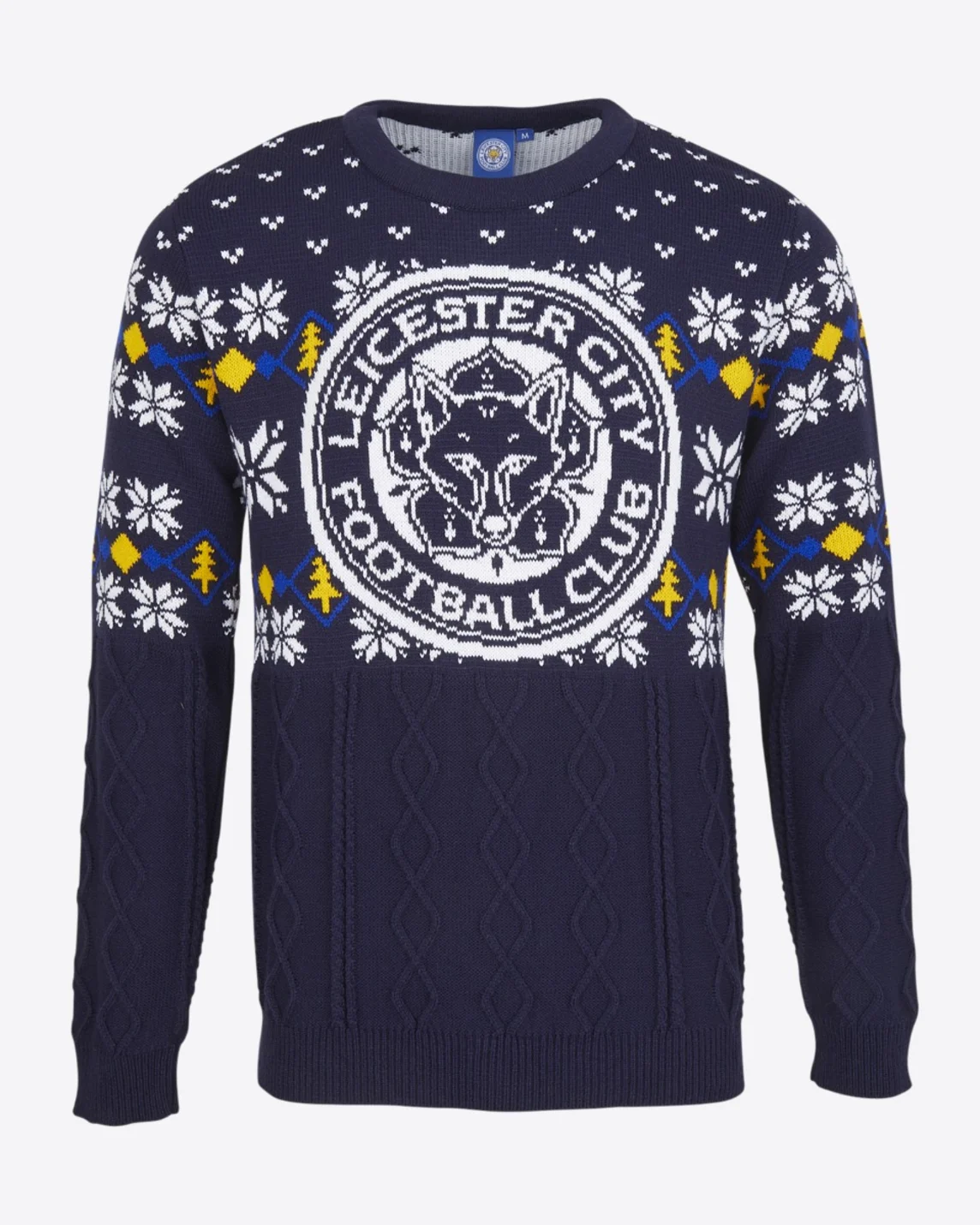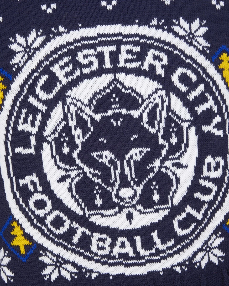 Show your festive Foxes pride in style with this official Leicester City Football Club Christmas Jumper. Crafted in a rich navy blue knit, this jumper features a bold, central woven crest of the iconic Leicester City logo, flanked by traditional holiday snowflake and tree patterns.
