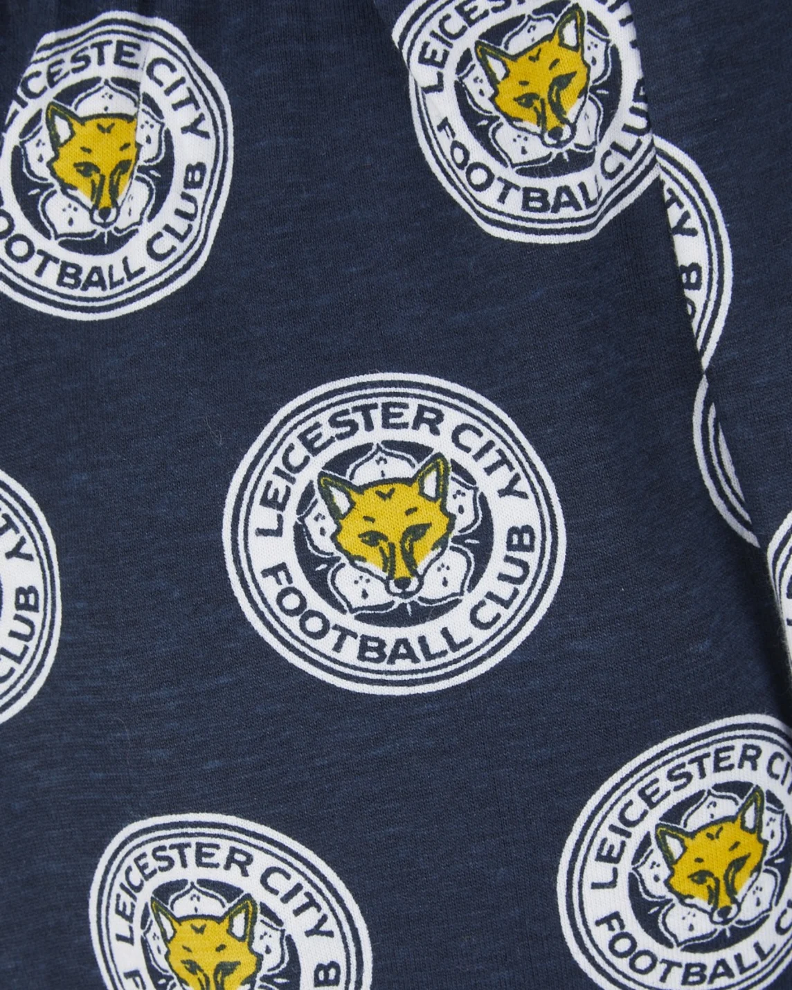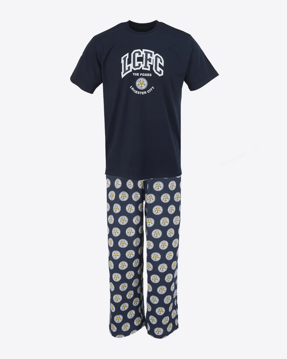 Featuring a classic navy short-sleeve top with bold LCFC and "The Foxes" branding, and matching lounge pants covered in an all-over club crest print.