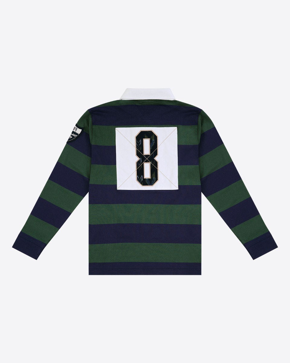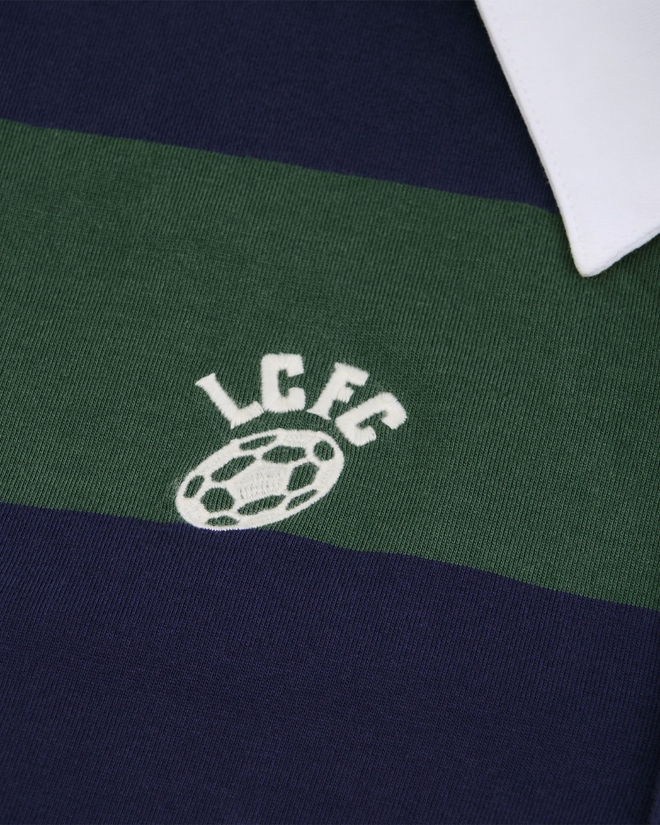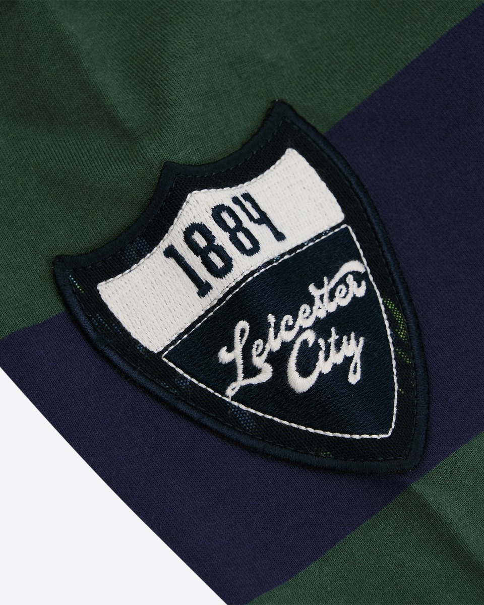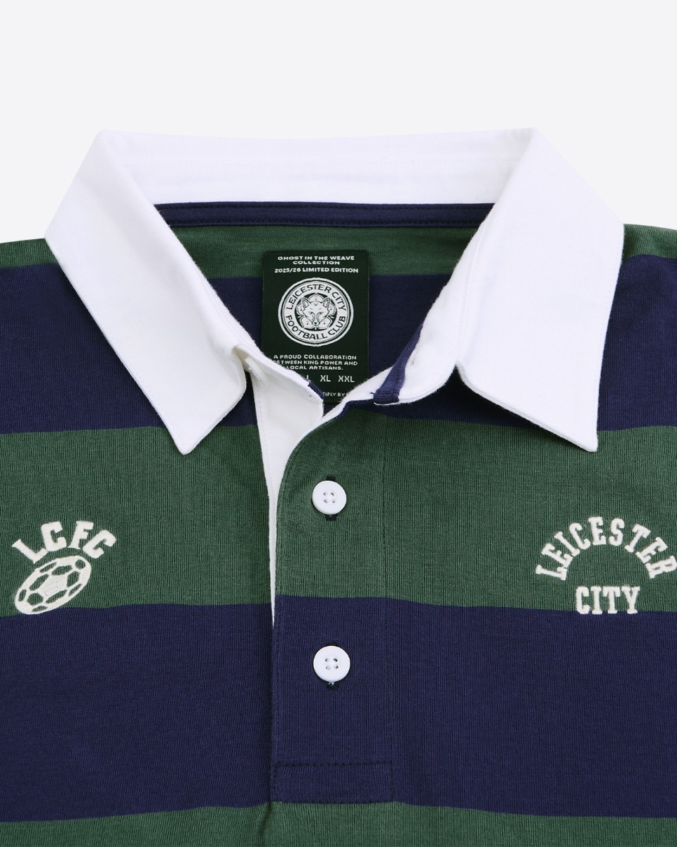Crafted from soft, comfortable cotton, this navy and green striped long-sleeve polo stands out with refined detailing. The left sleeve showcases a symbolic patch embroidered in pixel-style Mud Mee (Ikat) Silk with the text “1884 LEICESTER CITY.” On the back, a large number 8 is also embroidered using the same traditional Mud Mee (Ikat) Silk technique. The design fuses sporty aesthetics with Northeastern Thai craftsmanship, expressing LCFC’s identity with distinctive originality