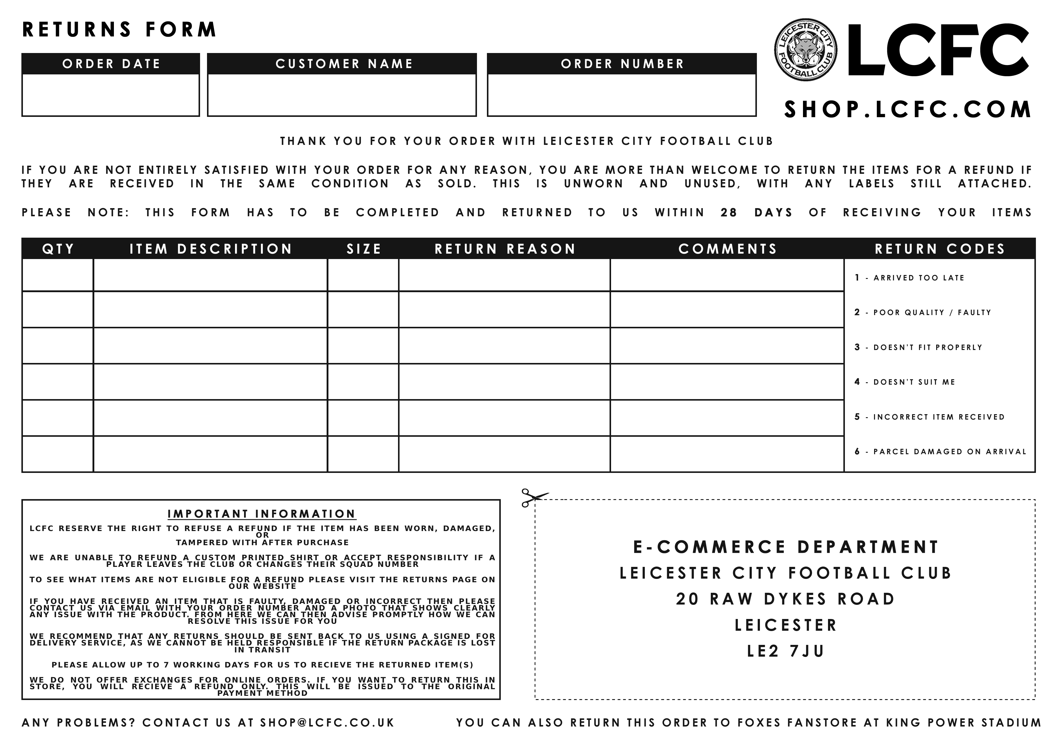 Alternatively, items can be returned to the Foxes Fanstore. Along with the returned items, please bring with you a copy of your order receipt, ensuring this is within the specified 28 days.