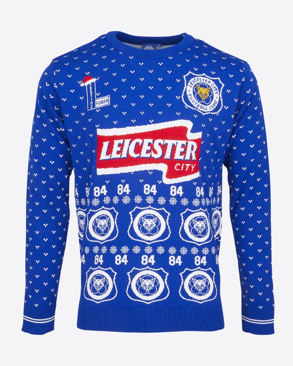 Featuring a large retro Leicester City graphic front and center, along with repeated 1996/98 year markers and vintage club crests throughout, this jumper captures the spirit of LCFC history with a fun holiday twist. Snowflakes and festive patterns complete the look for a perfect blend of football and festivity.