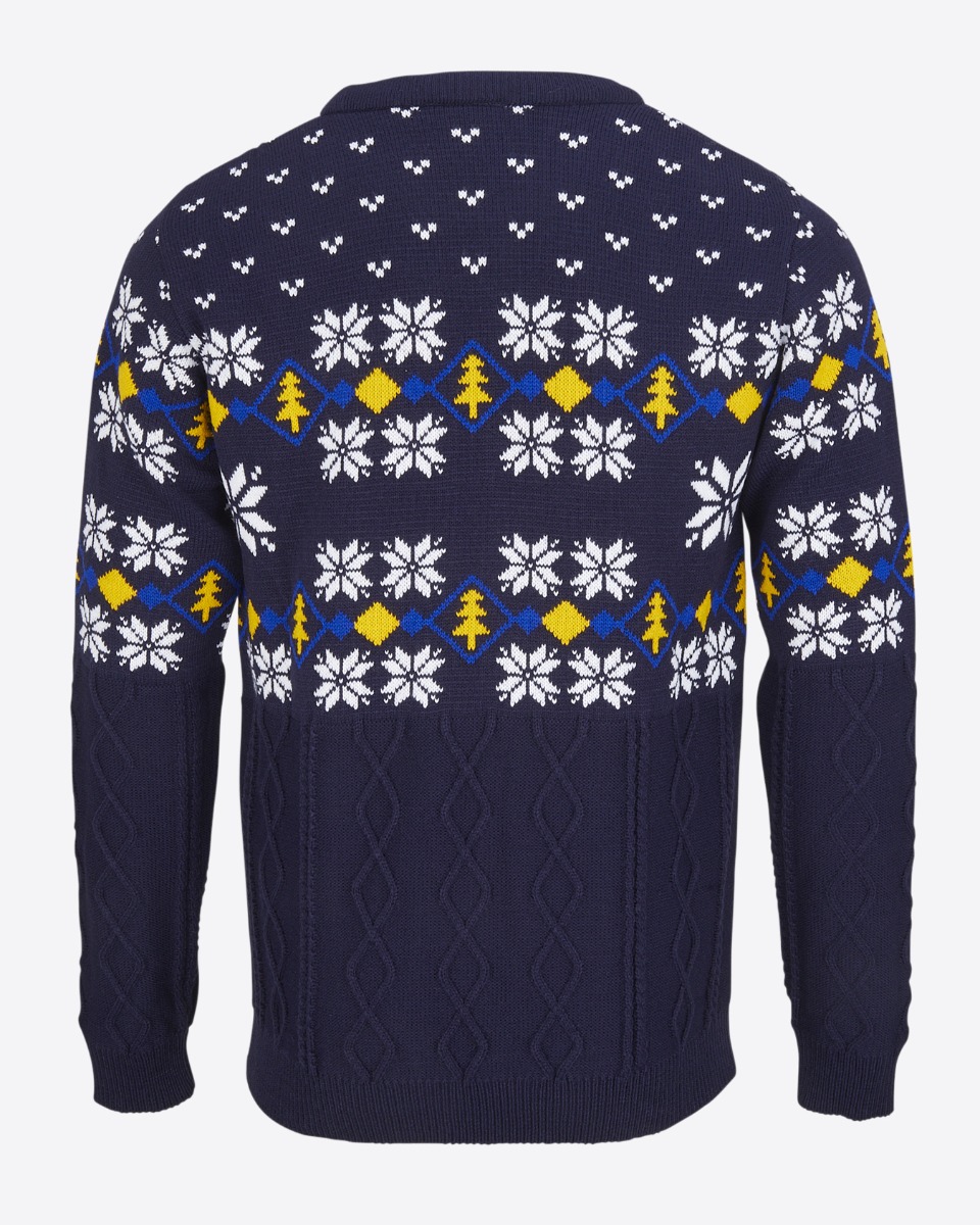 Show your festive Foxes pride in style with this official Leicester City Football Club Christmas Jumper. Crafted in a rich navy blue knit, this jumper features a bold, central woven crest of the iconic Leicester City logo, flanked by traditional holiday snowflake and tree patterns.