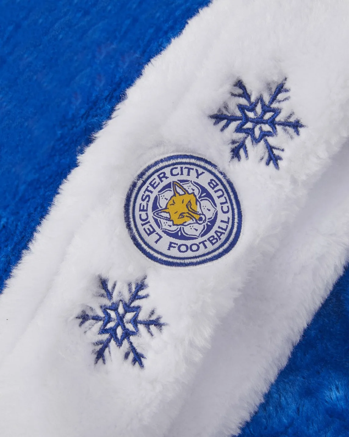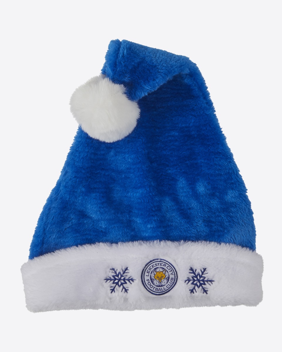 This bright blue Santa hat features a fluffy white trim with embroidered snowflakes and the iconic LCFC crest at the center. Topped with a fun snowball-style pom-pom.