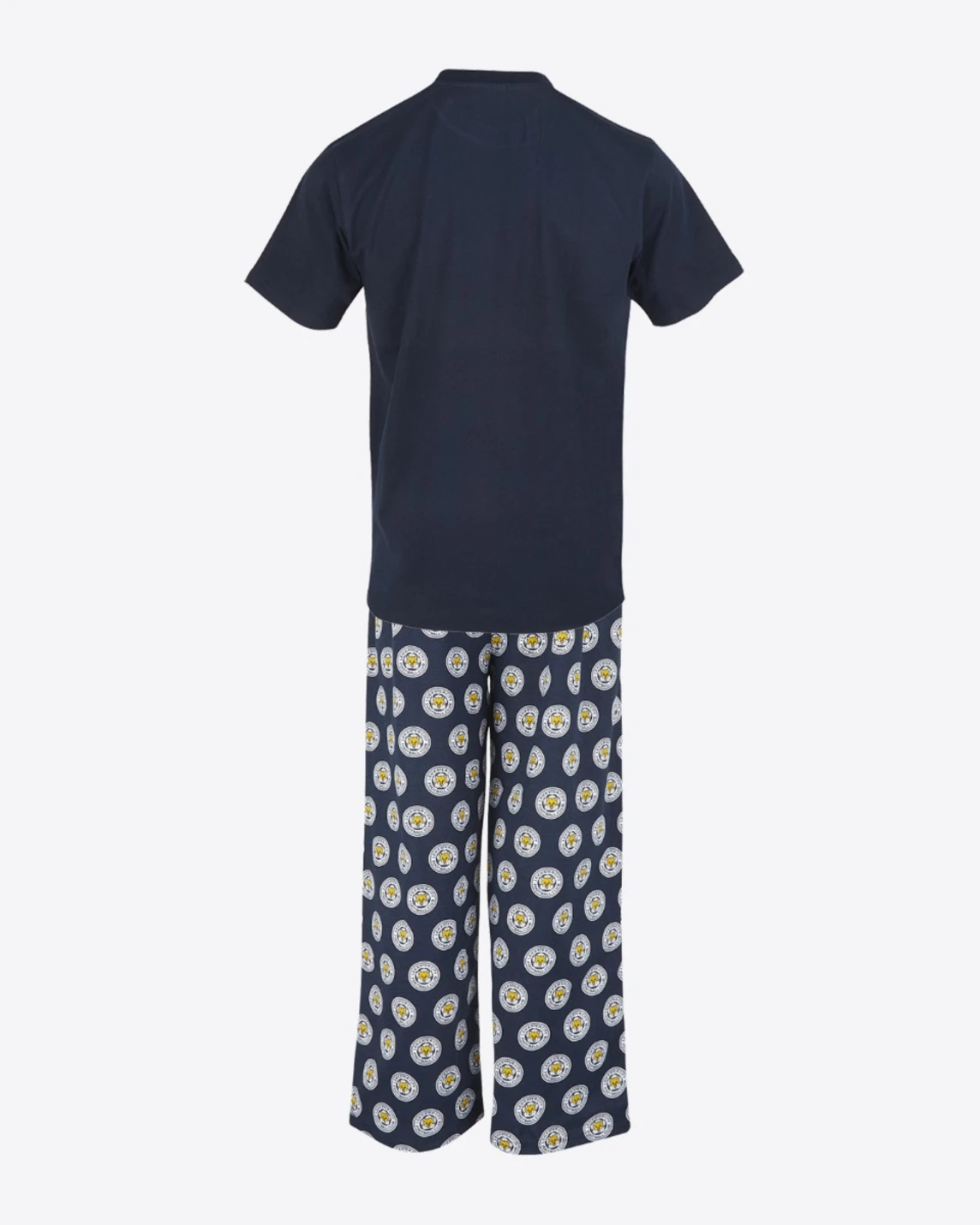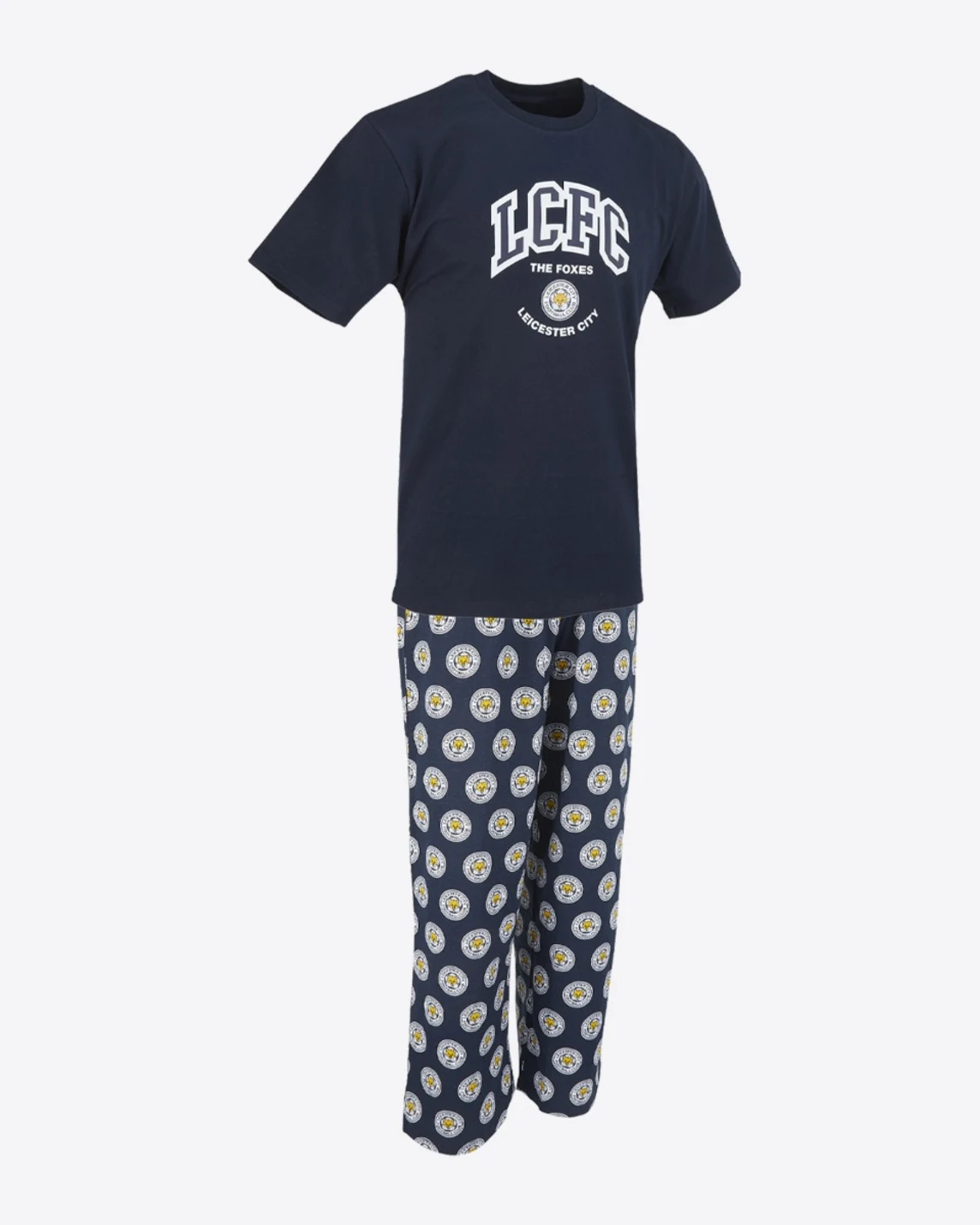 Featuring a classic navy short-sleeve top with bold LCFC and "The Foxes" branding, and matching lounge pants covered in an all-over club crest print.