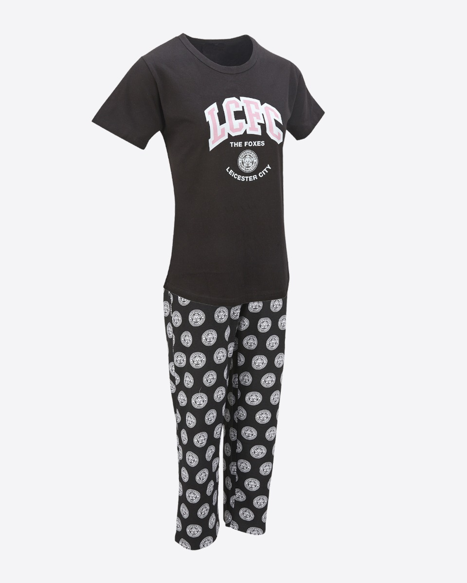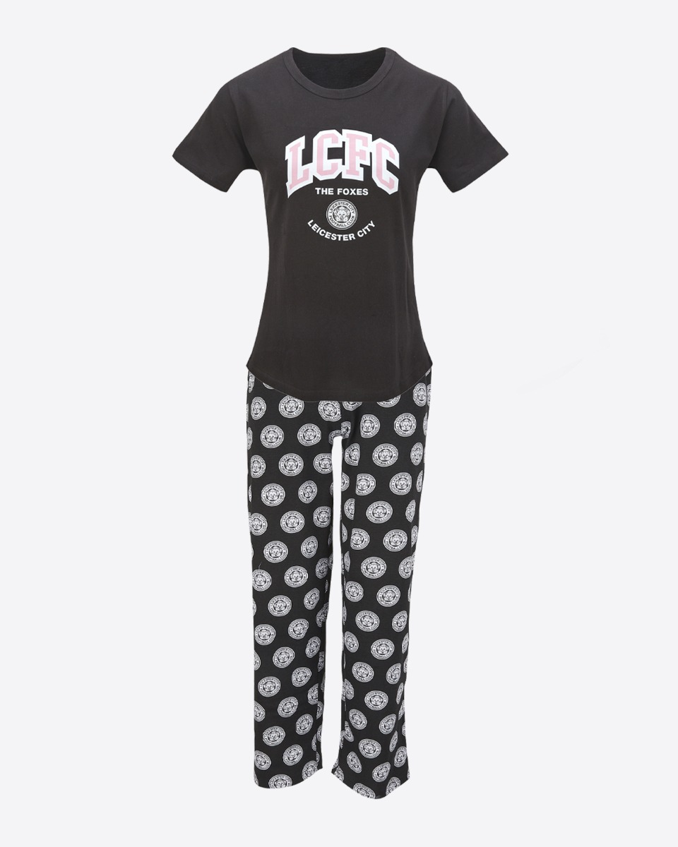 This 2-piece set features a soft, short-sleeve t-shirt with bold LCFC branding in pastel pink and white, paired with comfortable full-length trousers adorned with an all-over club crest print.