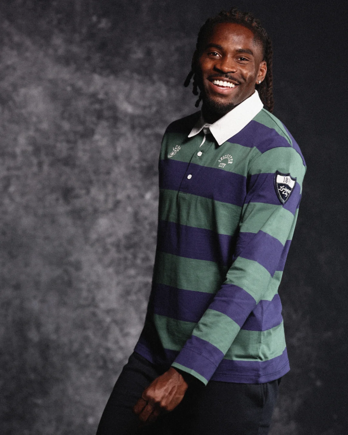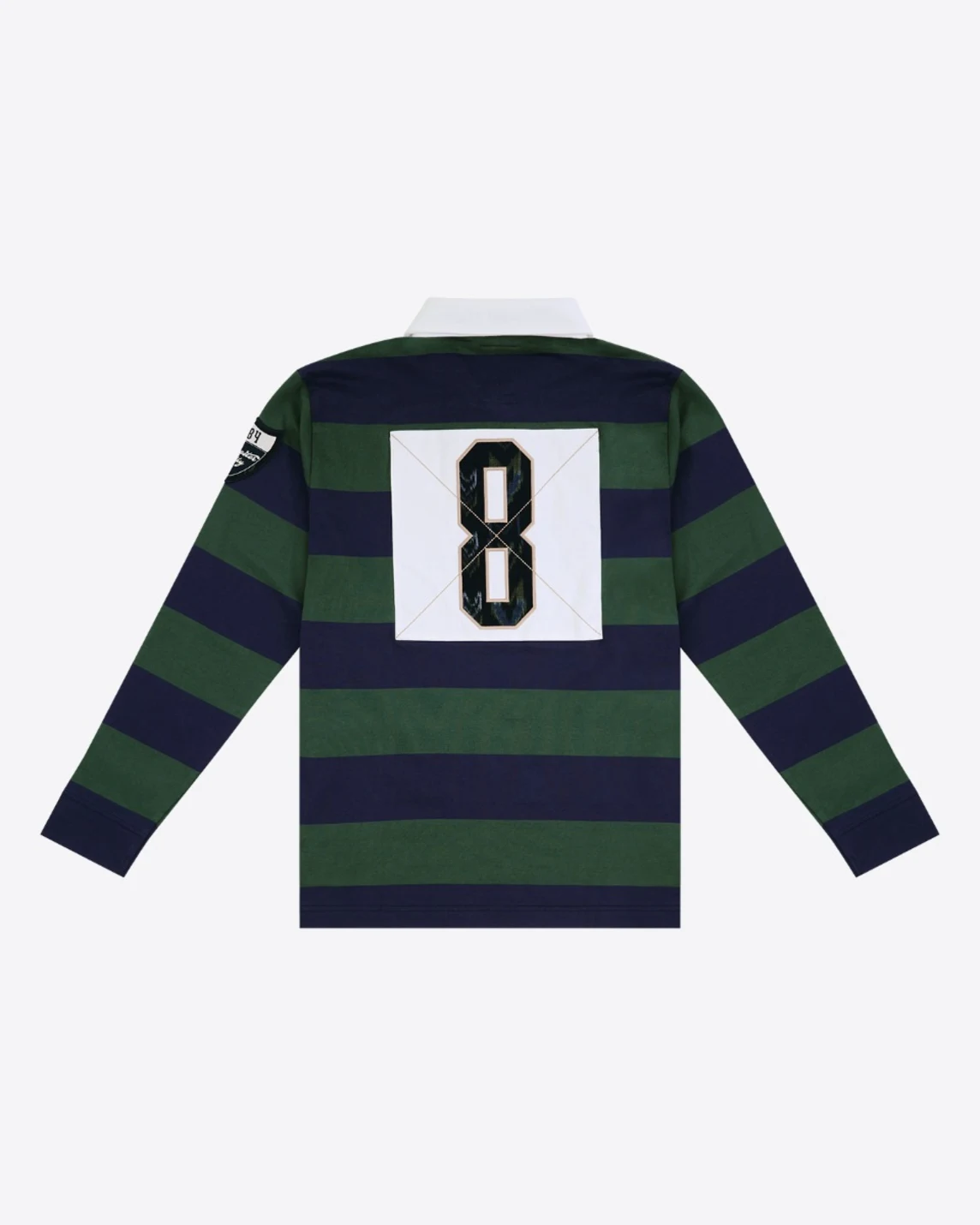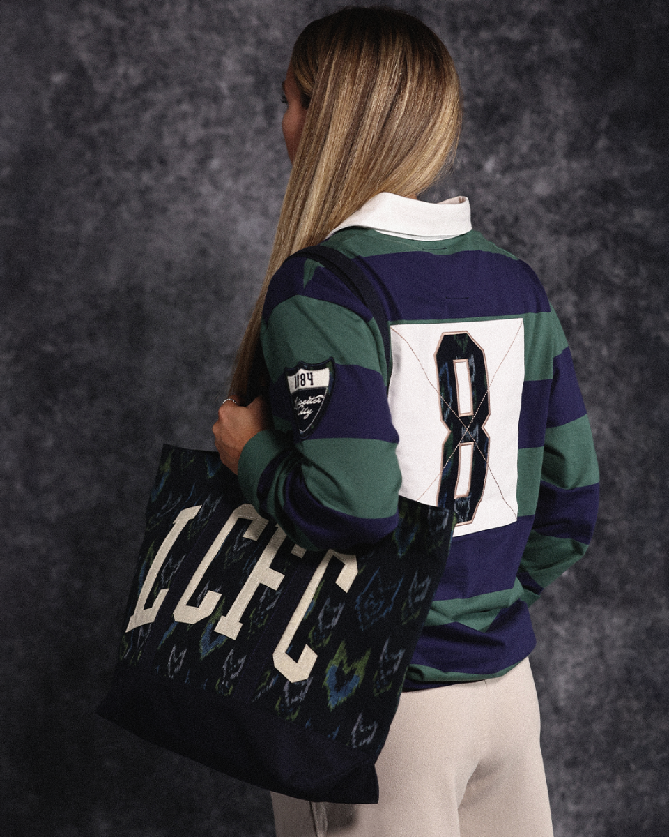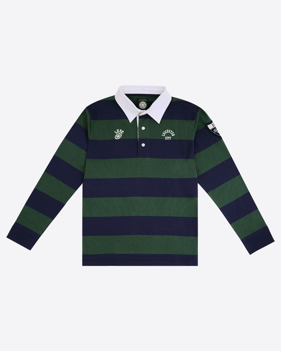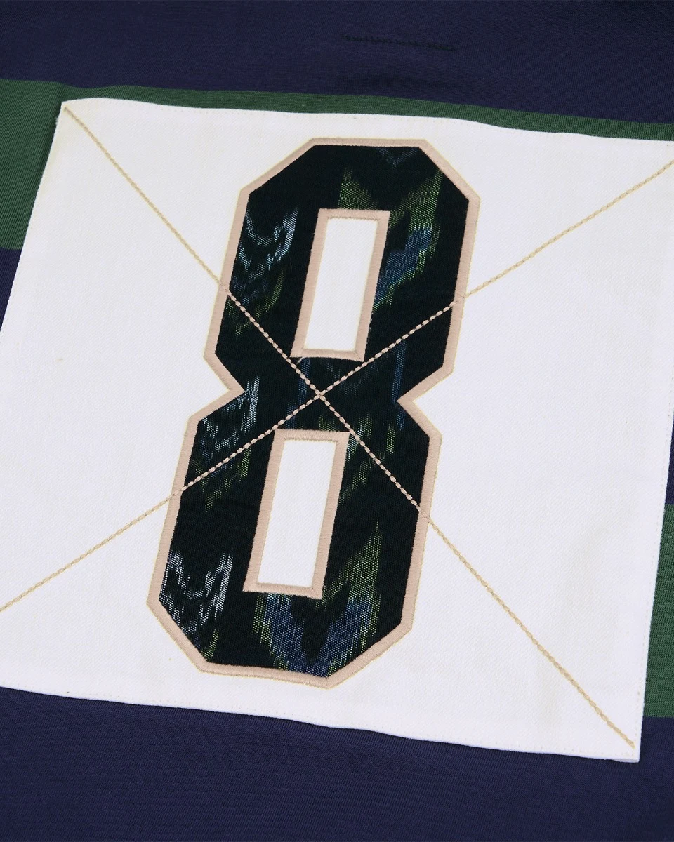 Crafted from soft, comfortable cotton, this navy and green striped long-sleeve polo stands out with refined detailing. The left sleeve showcases a symbolic patch embroidered in pixel-style Mud Mee (Ikat) Silk with the text “1884 LEICESTER CITY.” On the back, a large number 8 is also embroidered using the same traditional Mud Mee (Ikat) Silk technique. The design fuses sporty aesthetics with Northeastern Thai craftsmanship, expressing LCFC’s identity with distinctive originality