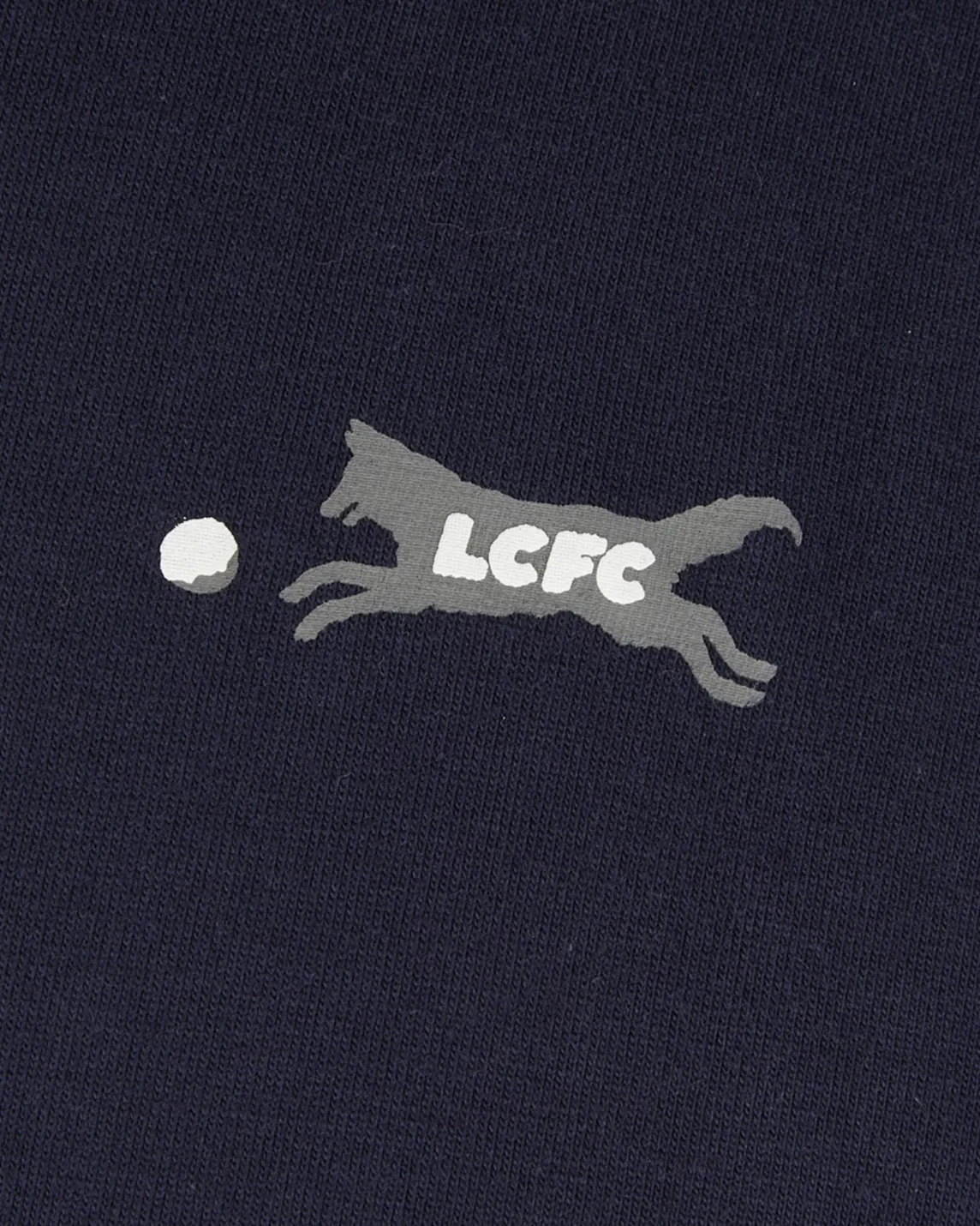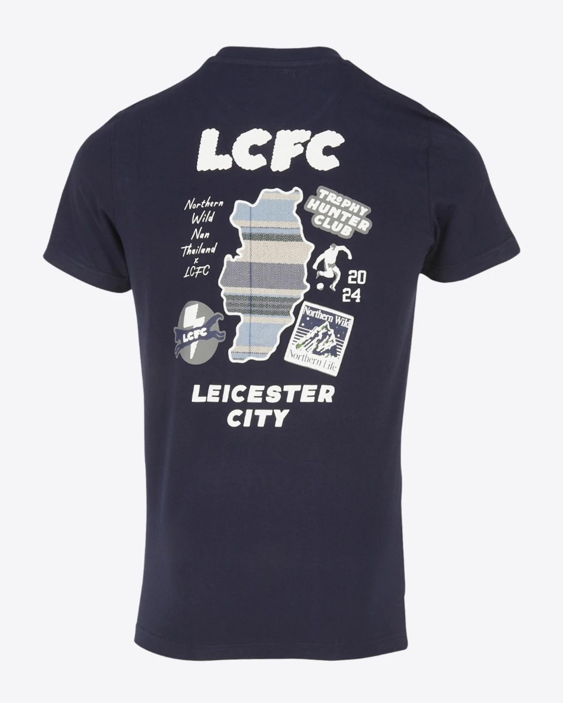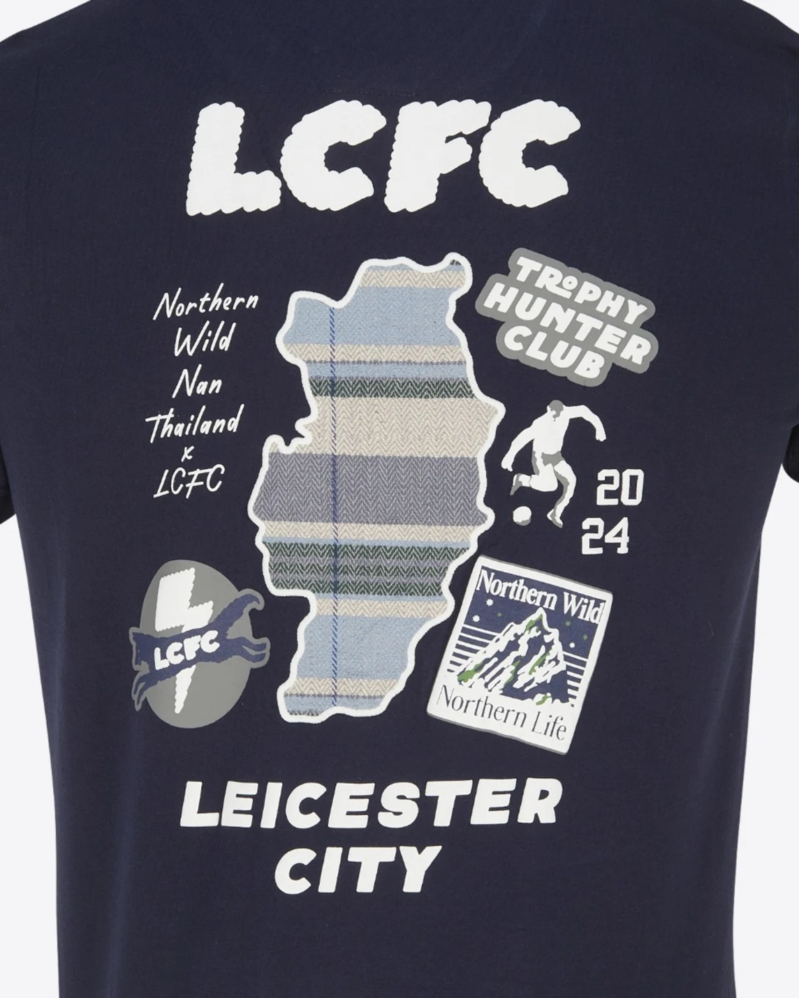 The Northern Wild, Northern Life navy blue short-sleeved crewneck T-shirt blends Leicester City’s fashion style with local textile weaving techniques, a unique craft of the Chiang Rai village community in Nan Province, northern Thailand. The design features patterns in natural mountain tones, beautifully embroidered onto the shirt, including details inspired by Nan Province's traditional fabrics. It also showcases a striking fox chasing a football, symbolizing the team's relentless pursuit of victory on the pitch, and inviting you to be part of this triumph.