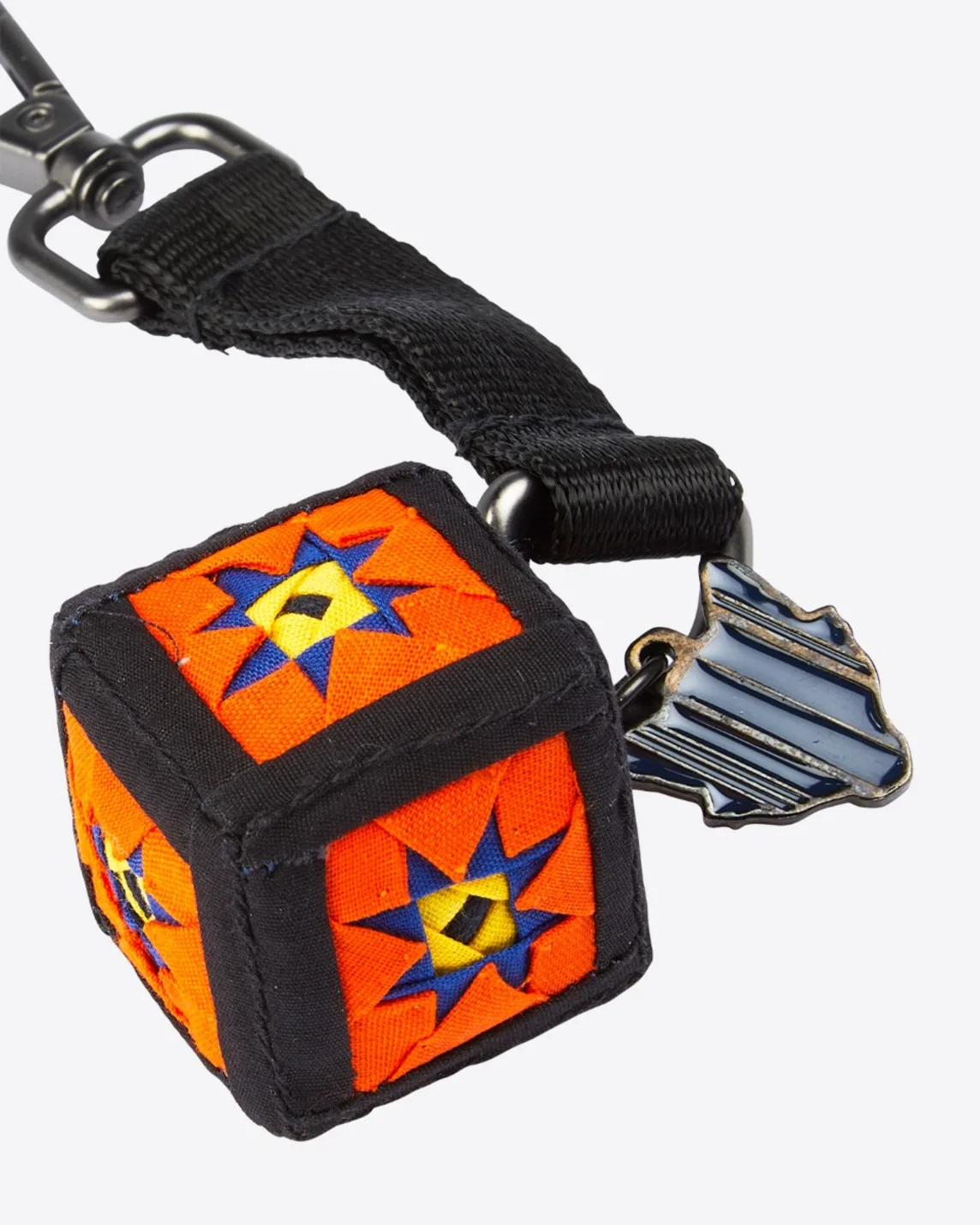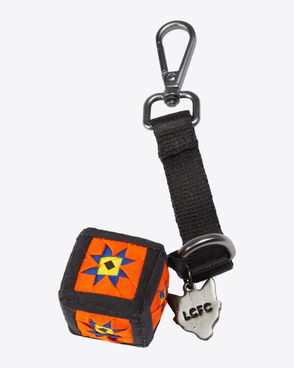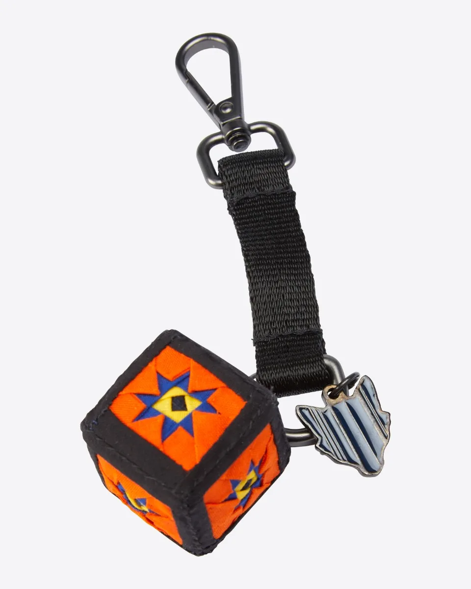 A keychain made into a lucky dice revered by the Thai Song Dum people, which has been shrunk in size to create this wonderful souvenir. Each face of the dice bursts with colour and the keepsake also includes a “Fox Face” Leicester City FC logo inspired by the watermelon-skin patterns synonymous with the Thai Song Dum people.